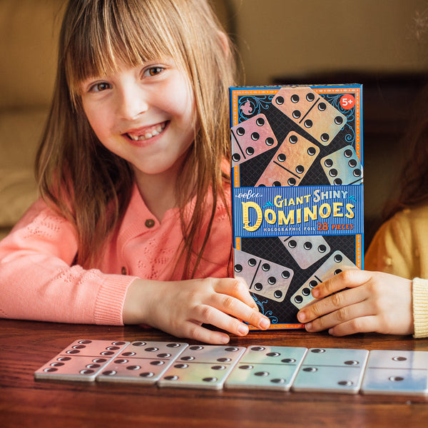 Giant Shiny Dominoes is the classic dominoes game we will remember.  Each die-cut domino piece features the classic numbers highlighted with shiny holographic foil.    The set includes twenty-eight dominos that are 4.5 x 2.25 inches and made of sturdy and thick cardboard.    The...